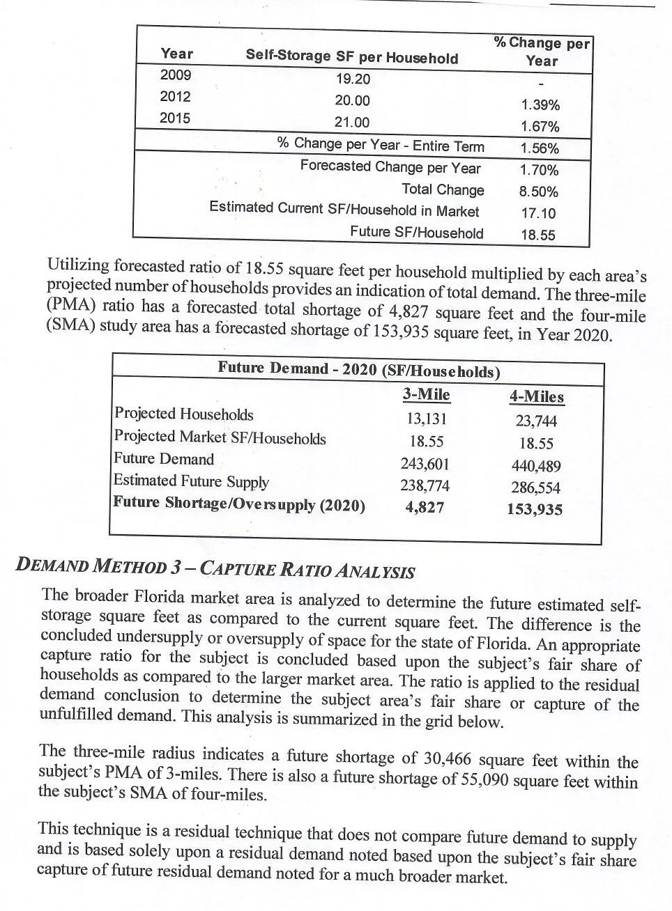 The person I often use for our self-storage feasibility studies often uses three different “demand methods” to determine how much demand there is. See the example below for a self-storage feasibility study.